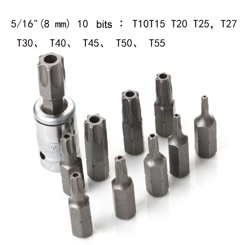 10Pcs 5/16'' Bits: T10,15,20,25,27,30,40,45,50,55