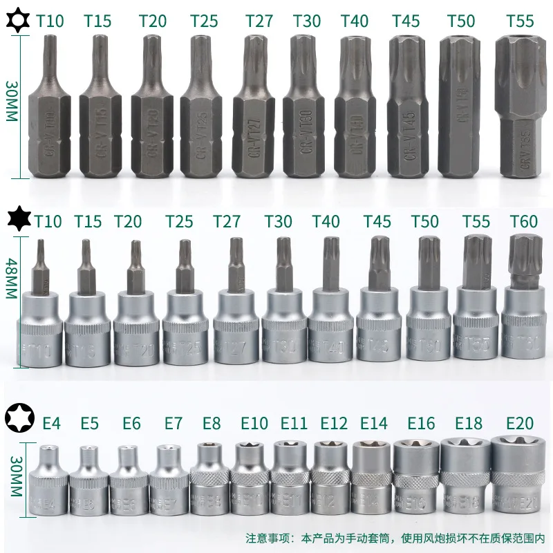 E socket bits have a hole drilled in them to prevent tamper garage. Made of high quality chrome vanadium steel, it is strong and super durable. Combined with chrome vanadium steel sockets, it can provide greater turning power for superior torqu