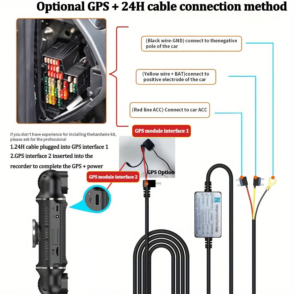 3.24H+GPS configuration will have two power supplies, MINI USB car charger and MINI USB 24H step-down cable, choose one of the power supply mode (car charger/24H cable), the power supply connects to the GPS and then connects to the recorder.