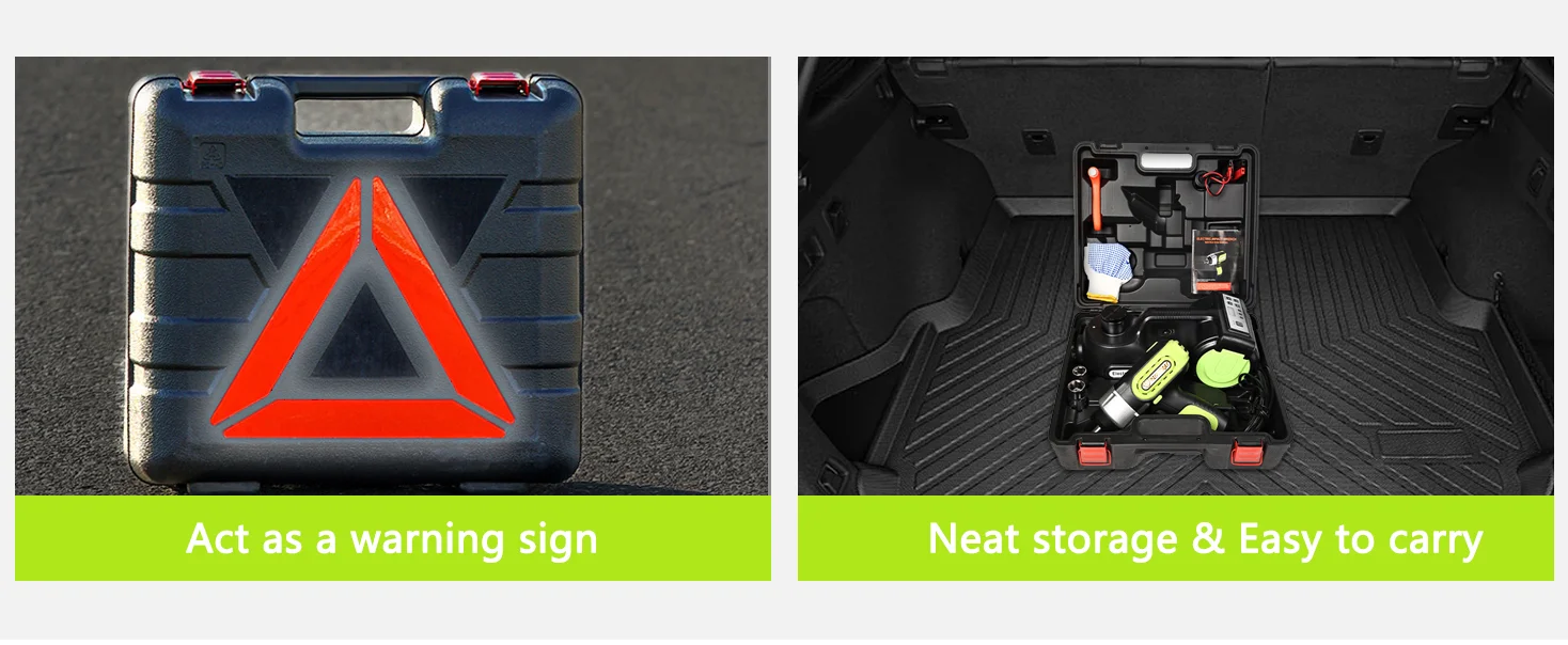 1.The Vehicle Repairing Kit Including: Electric Jack, Electric Wrench, two Sockets, a pair of Gloves, Extension Cord with Battery Clamp, Car Charger, and a sturdy Storage Case.