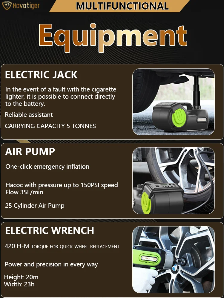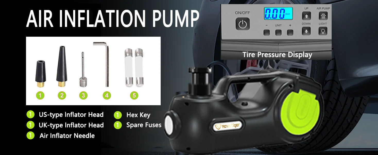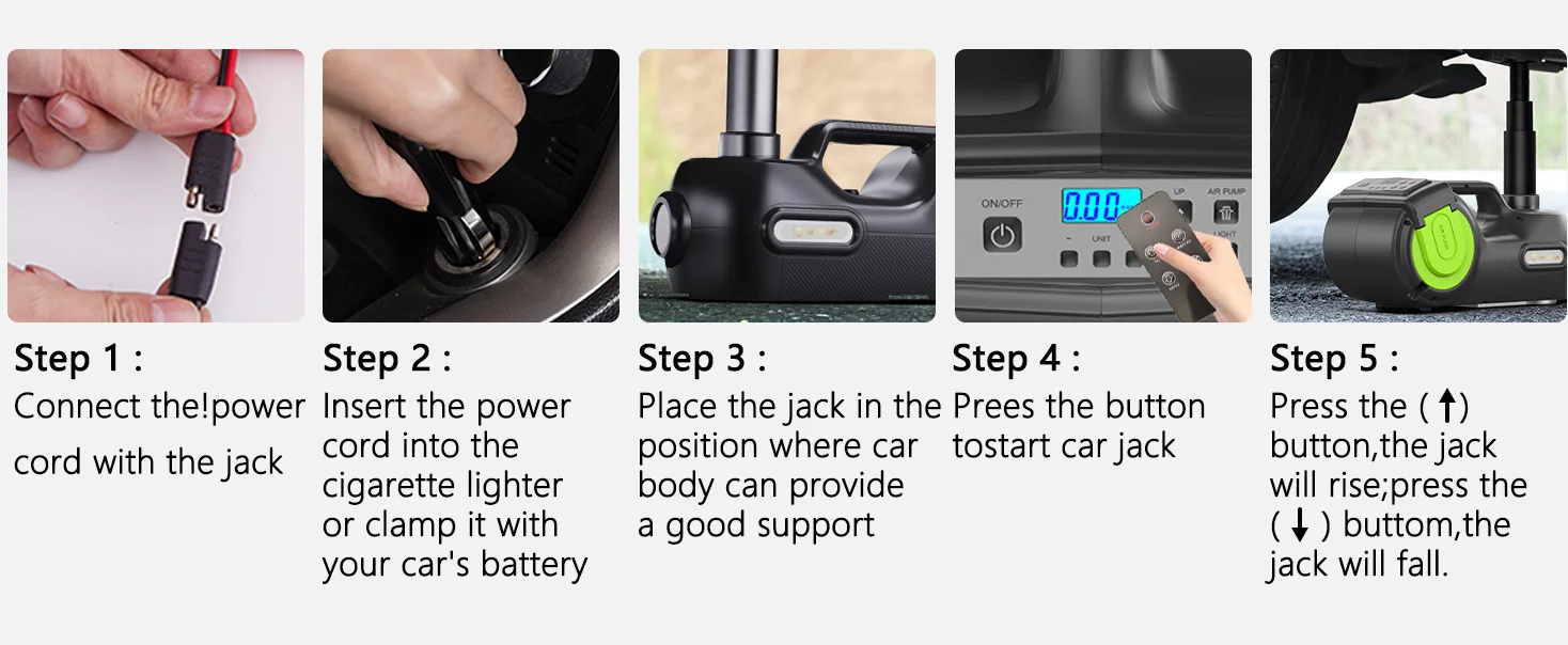 2.Multi-function Electric Hydraulic Jack: the electric jack is a very versatile tool with the function of jack, air pump, and flashlight. A good helper for change the tire quickly.