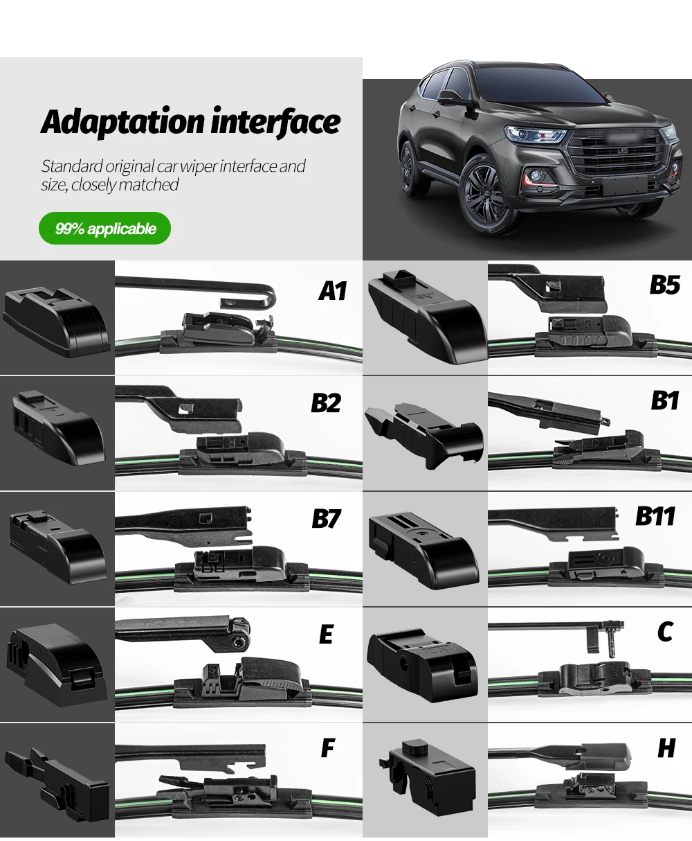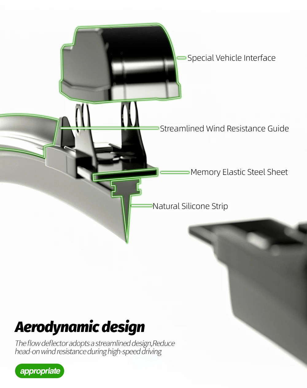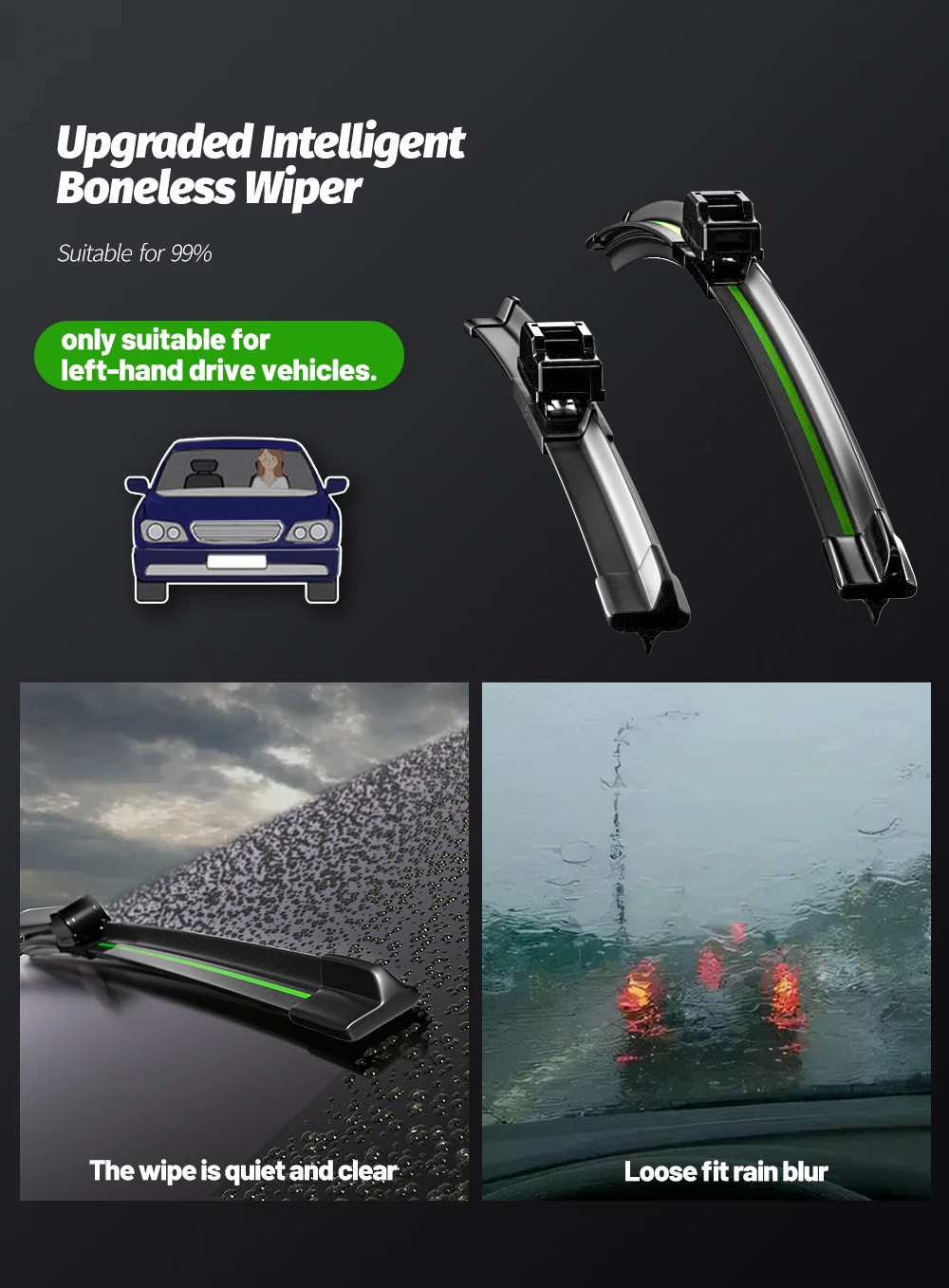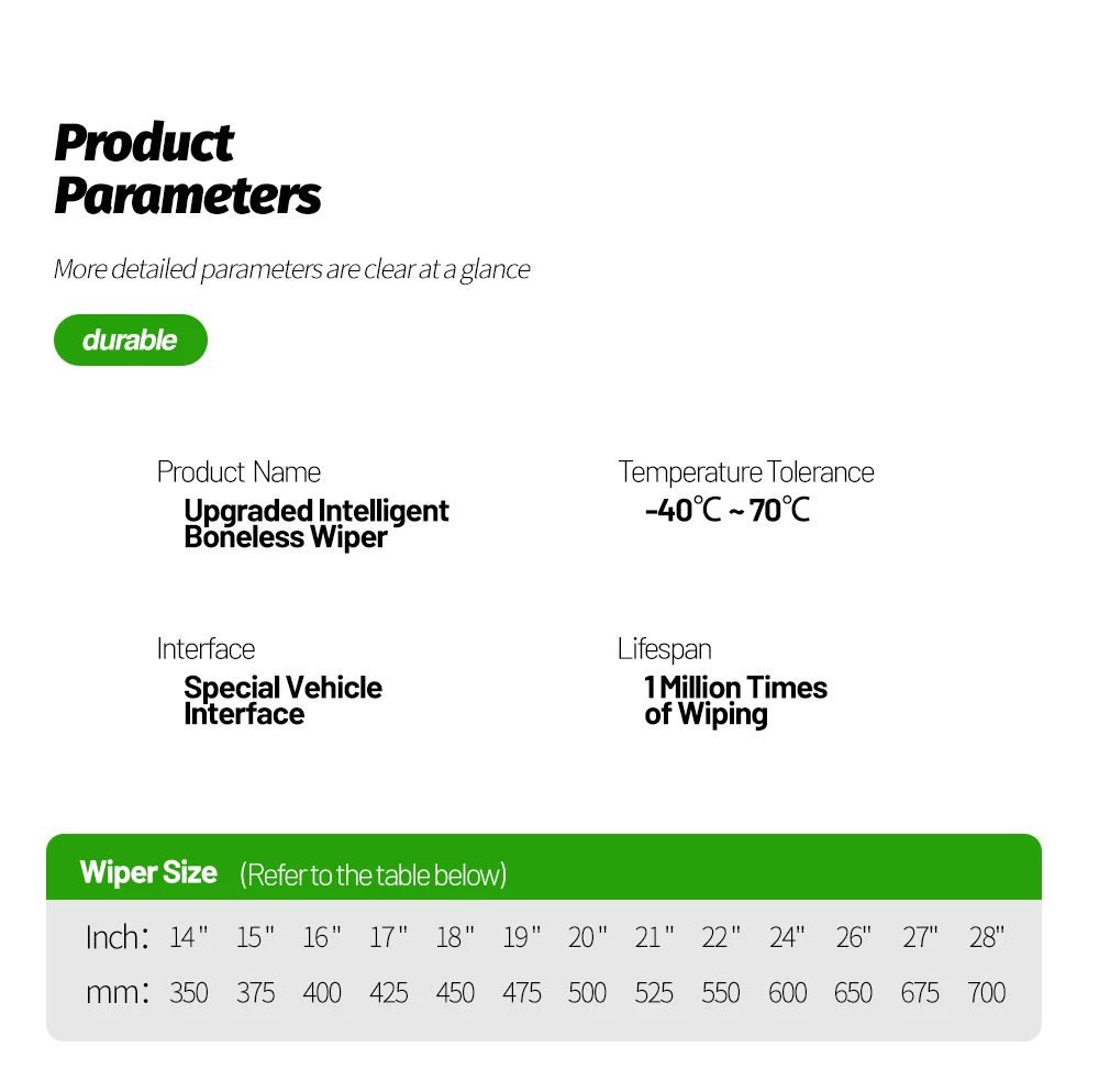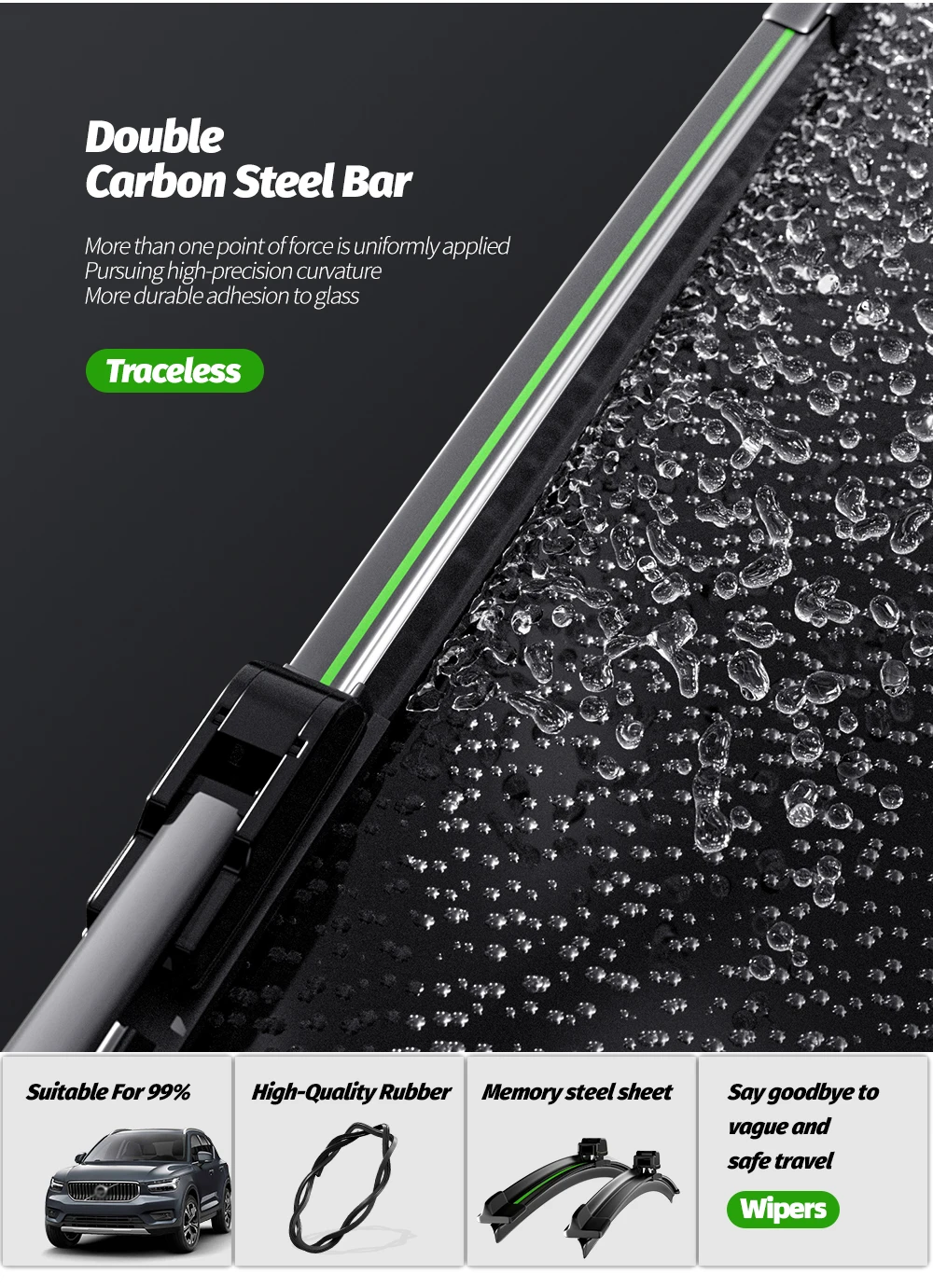 Tension memory applies even pressure along the entire blade lengt. Specially blended rubber delivers the ultimate smooth, clean, chatter-free wiper. Aerodynamic design significantly reduces drag, noise and wind lift. Intelligent boneless wiper,prevents ice and snow build-up from the exposure of metal/plastic components. Easy and quick installation, perfect fit, no need for awkward adapters, install in seconds.