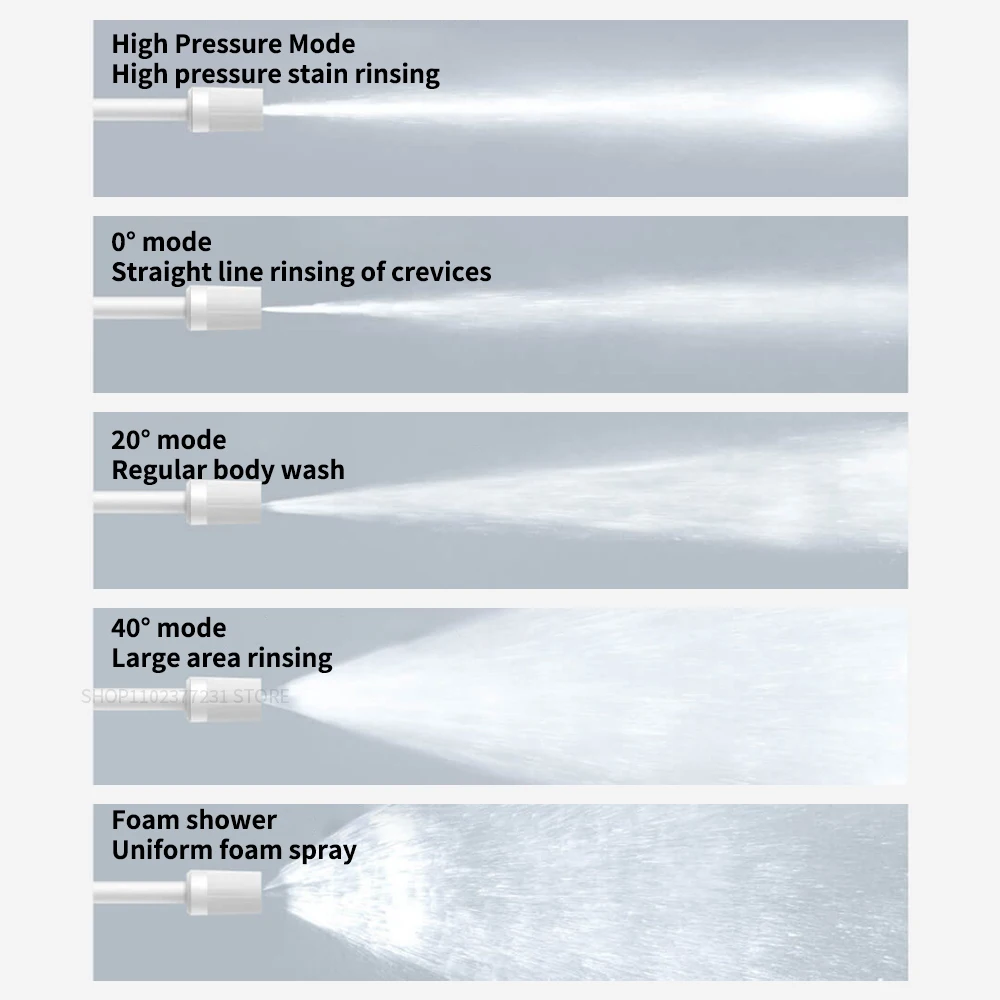 -With 5-in-1 multifunctional nozzle, a variety of angles of the water type to easily deal with a variety of scene needs, directly rotating the nozzle can switch mode, greatly improving the cleaning efficiency.-High Pressure Mode High pressure stain rinsing