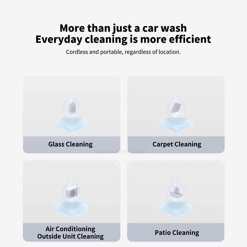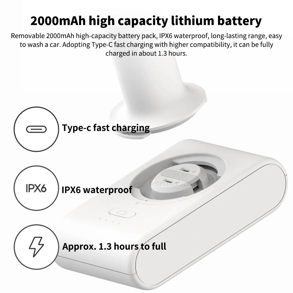 -Removable 2000mAh high-capacity battery pack, IPX6 waterproof, long-lasting range, easy to wash a car. Adopting Type-C fast charging with higher compatibility, it can be fully charged in about 1.3 hours.